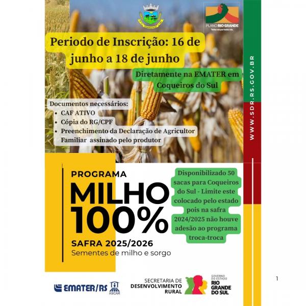 Estão abertas as inscrições para o Programa Estadual Milho 100%, que garante o repasse de sementes de milho e sorgo com 100% de subsídio pelo Governo do Estado do RS,