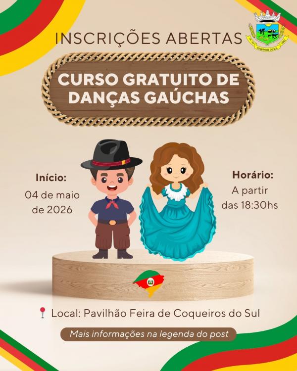 A Administração Municipal de Coqueiros do Sul informa que estão abertas as inscrições para o Grupo de Dança Gaúcha, uma iniciativa que busca